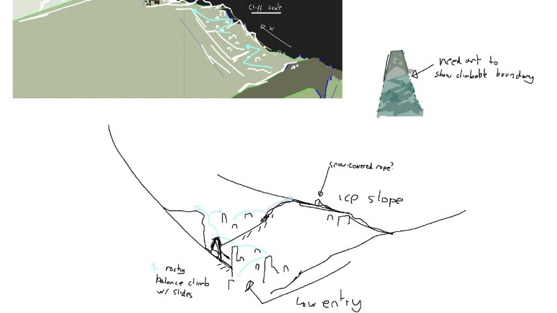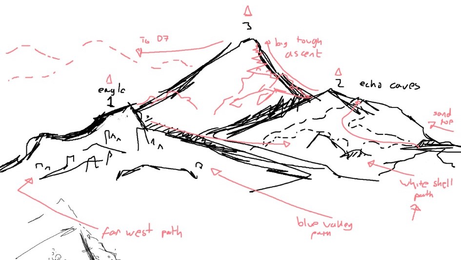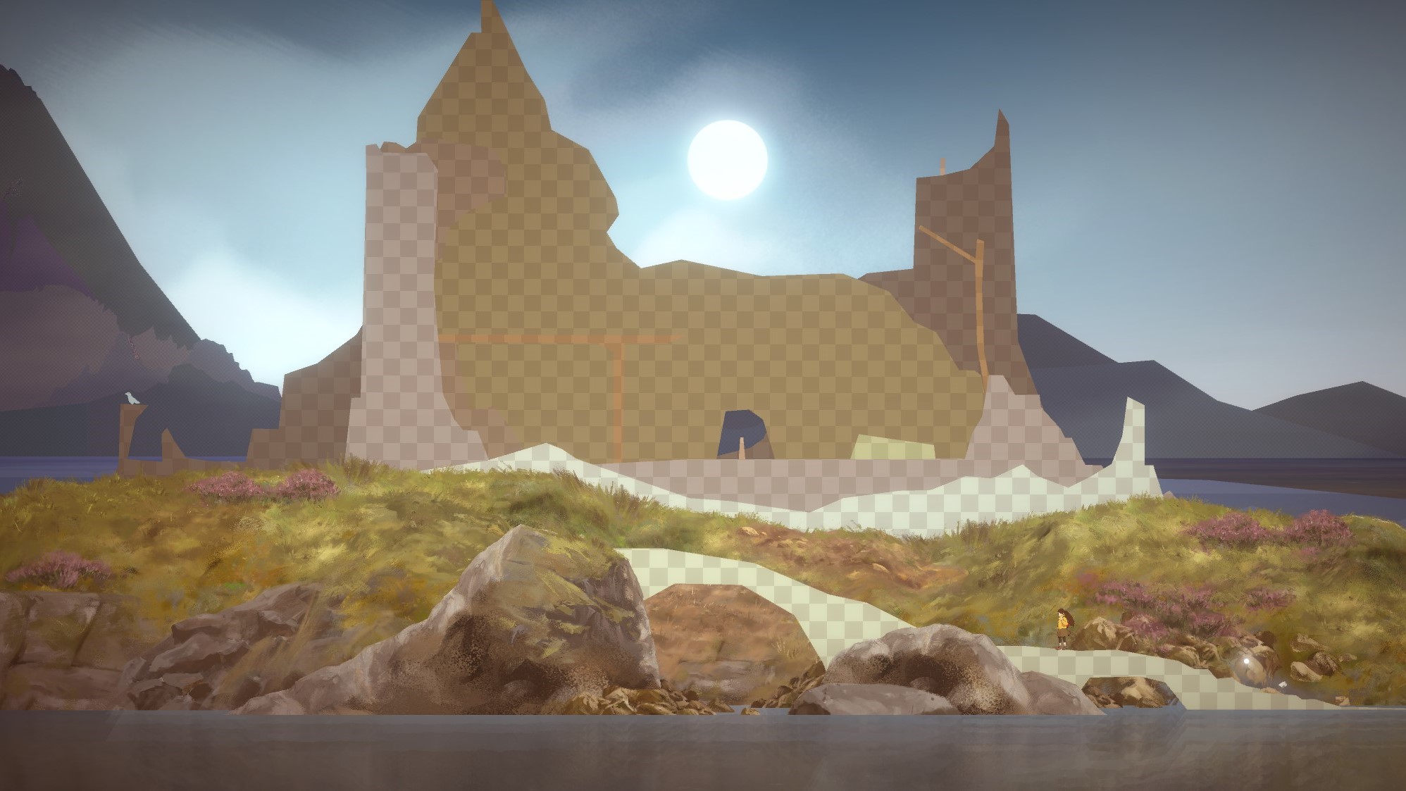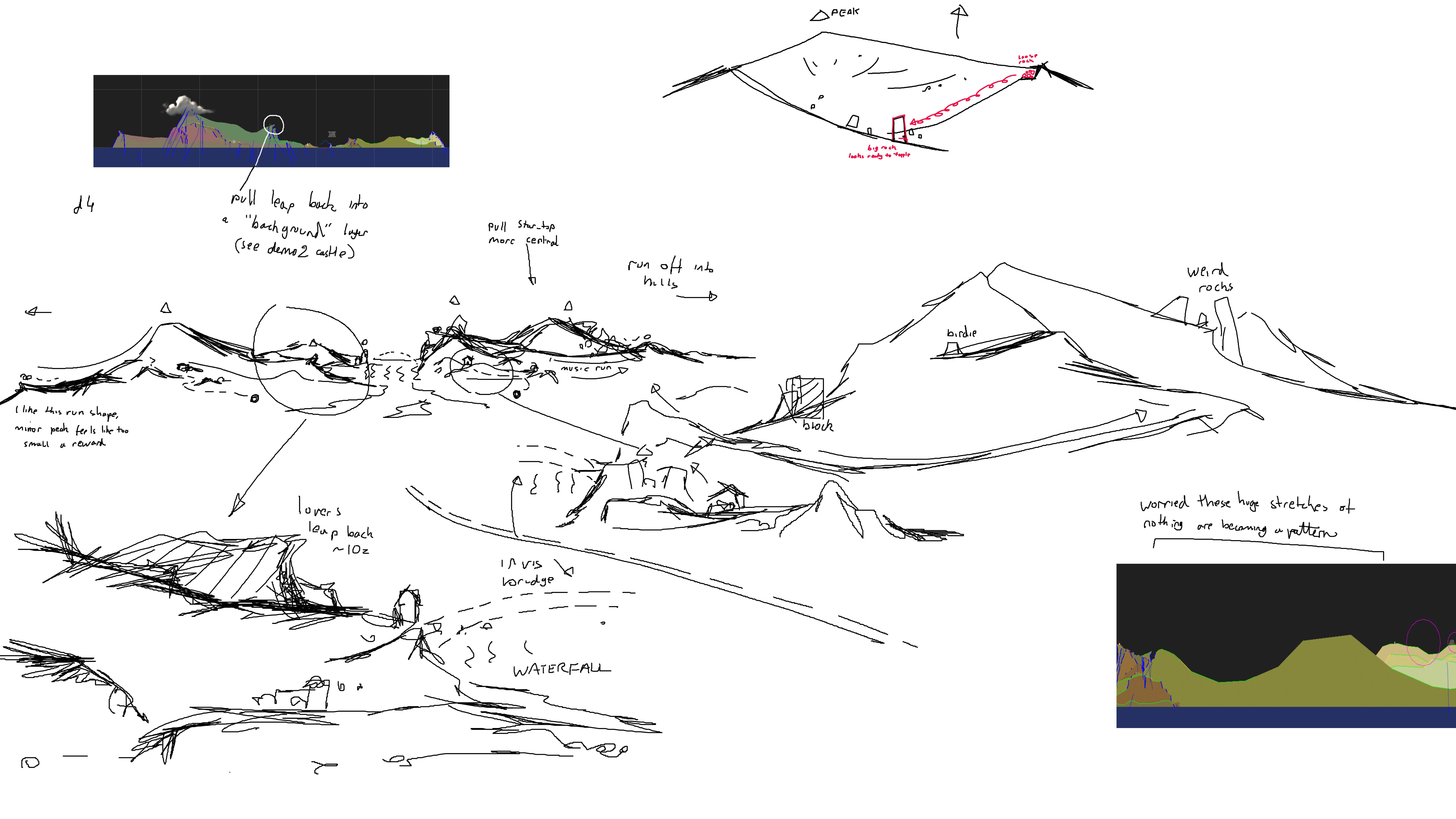 Another mechanic we’ve introduced in Highland is the idea of “maps”. Hidden in the world are sketches of landmarks Moira can track down from peaks, opening shortcuts and secret areas to those with keen eyes (a path hidden between odd-looking trees, for example). This encourages me as a designer to create interesting-looking geography and gives the world a rich density of routes a player may take through it. These maps persist through playthroughs, encouraging players to come back and see what they’ve missed.