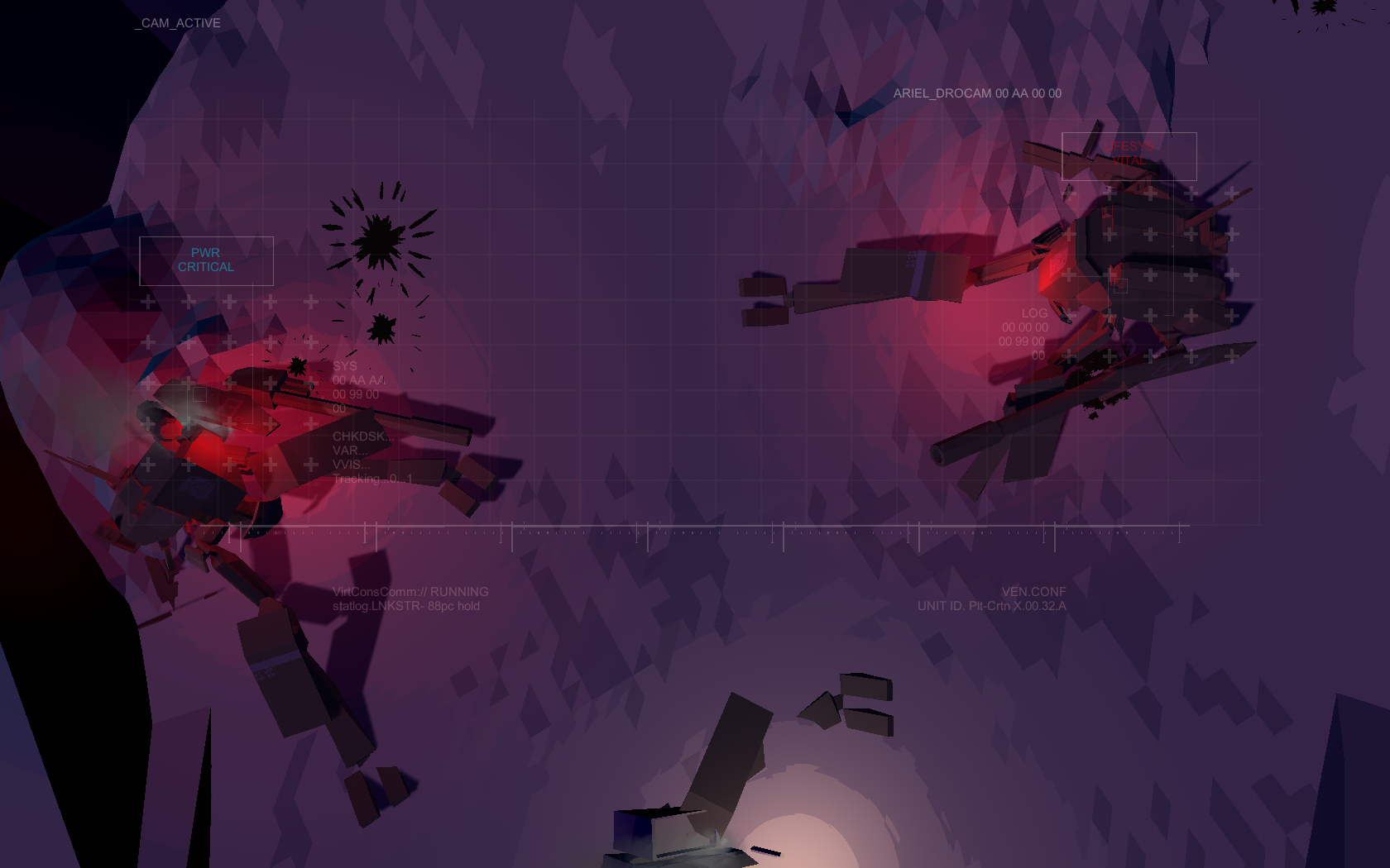 Can Androids Pray is a short sci-fi tragedy written by Xalavier Nelson Jr (Hypnospace Outlaw, An Airport for Aliens Currently Run by Dogs) with an original soundtrack by Priscilla Snow, following two doomed mech pilots as they approach their imminent deaths. My role for the game was, effectively, everything that wasn’t the narrative script or soundtrack. Art assets, world design, visual scripting, camera choreography, UI, lighting—everything that happened in the Unity project was my responsibility.