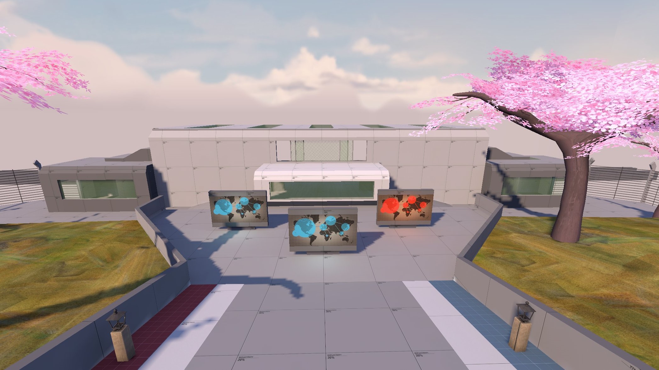 Hermes, then, is built around the main facility building. With an open roof and courtyards, this spot is designed to facilitate both more mobile legends and give defenders spots to turtle up. A sloped field surrounds, flowing down towards a more exposed train station with an easily fortified facade complemented by exposed sides and rear.
