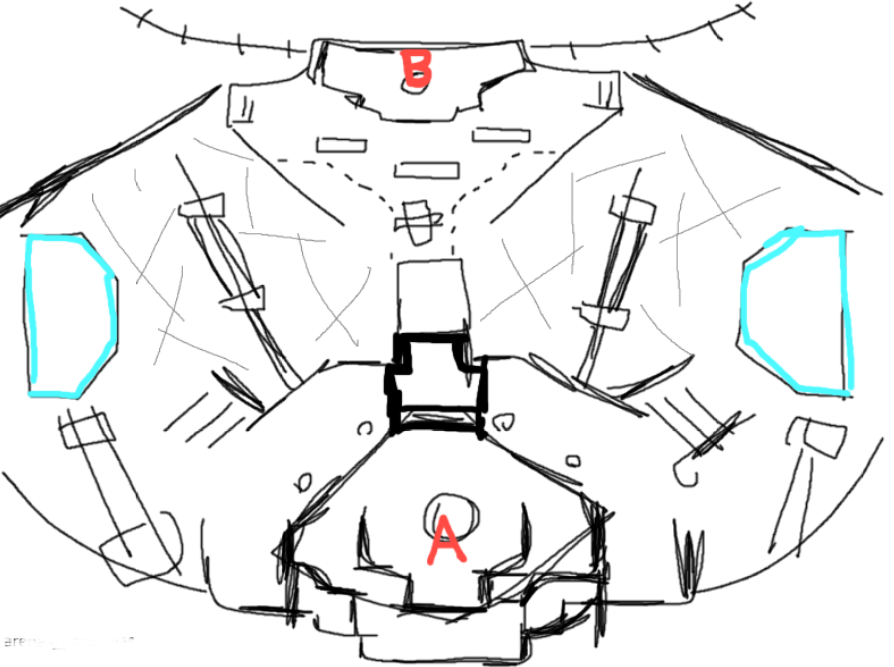 Starting with a rough paint sketch, I blocked out an initial layout starting with a mid-section where I imagined most of the action would take place. While many Arenas maps are designed as BR-lite (two distinct POIs with an open field in between), I wanted to pull more from maps like Overflow and Drop-Off — maps that have a more singular “structure” to their overall shape.